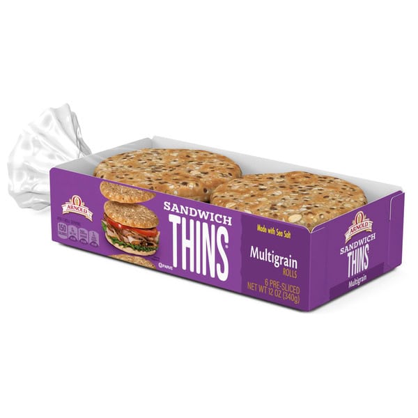 6 pre-sliced Multigrain Sandwich Thins rolls made with premium ingredients like olive oil and sea salt
