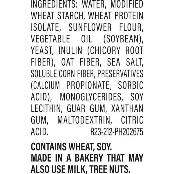Water, Modified Wheat Starch, Wheat Protein Isolate, Sunflower Flour Vegetable Oil (soybean), Yeast, Inulin (chicory Root Fiber), Oat Fiber, Sea Salt, Soluble Corn Fiber, Preservatives (calcium Propionate, Sorbic Acid), Monoglycerides, Soy Lecithin, Guar Gum, Xanthan Gum, Maltodextrin, Citric Acid