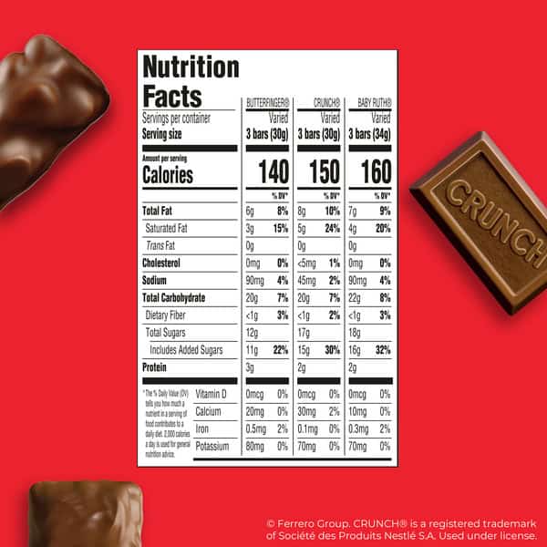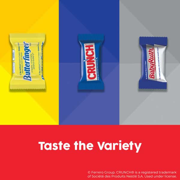 Enjoy the tasty variety of fan favorites like Butterfinger, CRUNCH and Baby Ruth in this 90-count bag of assorted Minis candy bars. Discover a variety of chocolatey candy bars that are perfectly classic and delicious. From peanut-buttery Butterfinger to the chewy, crunchy goodness of Baby Ruth, to the crunchy texture of CRUNCH you know and love, these classic candy bars are individually wrapped. Great for savoring as a treat, reward or during an office break getaway, these irresistible Minis bars also make the perfect candy to share with friends, family and coworkers. Grab a bag of assorted favorites today and add a variety of chocolatey treats to your every day.