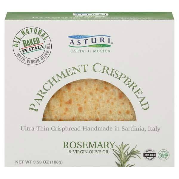 Carta di musica. With virgin olive oil. Live. Love. Snack. There are only five areas in the world that are considered Blue Zones, where people live longer, due in part to their healthier diet. The island of Sardinia, Italy is one of those places, where our All Natural Parchment Crisps are freshly baked. The rich history of this delicious and versatile long-life crispbread dates back to a time when they were traditionally used by local shepherds while traveling for extended periods. Our Asturi Parchment Crispbread, also known as Carta di Musica because of its almost-transparent thinness, is handcrafted using only the highest quality Durum Wheat Semolina, Rosemary and Virgin Olive Oil. Utilizing age-old artisanal methods, it is crafted over a full two days, ensuring the quality and flavor in every bite. Our gourmet parchment crispbread pair beautifully with classic Mediterranean foods, like prosciutto and savory cheese. They are also perfect with soups and salads, and of course, with your favorite charcuterie boards. We do not use milk, cheese, eggs, or honey in our recipe, making it ideal for vegan lifestyles! You can snack guilt free because our delicious Parchment Bread/Cracker are baked with: 100% natural and simple ingredients; 100% virgin olive oil; durum wheat semolina; plant-based, vegan – No milk, cheese, eggs, or honey; no artificial colorings; no preservatives.