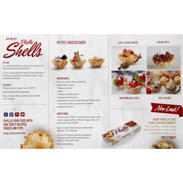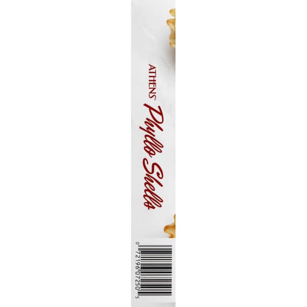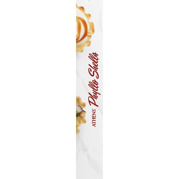 Per 2 Phyllo Shells: 30 calories; 0 g sat fat (0% DV); 20 mg sodium (1% DV); 0 g sugars. Vegan. May be produced in genetic engineering. New look. Same shells. Fully baked. New look! www.athensfoods.com. Facebook. Twitter. Pinterest. Instagram. Phyllo your feed with our tasty recipes, videos and tips. Want more of that flaky, golden crunch? Make turnovers, strudels, pot pies and more with Athens phyllo dough. Located in the freezer sections. Try it today! Sustainable Forestry Initiative: Certified fiber sourcing. www.sfiprogram.org.