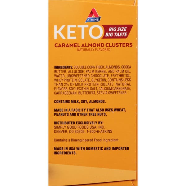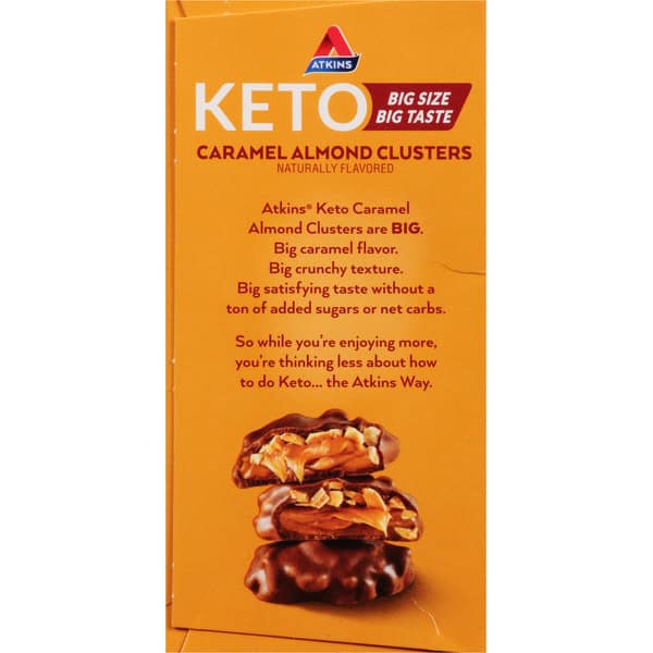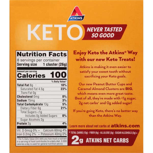 • SATISFY YOUR SWEET TOOTH. Atkins Keto Caramel Almond Clusters. 2g of net carbs and less than 1g of sugar per