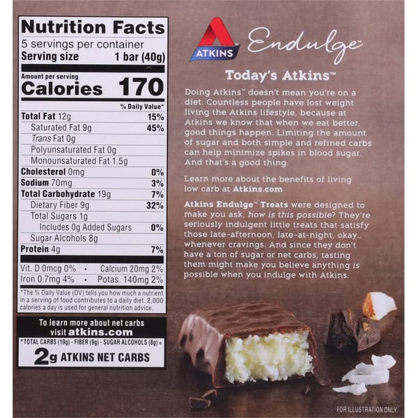 Enjoy Atkins™ Chocolate Coconut Bars. Each sweet Endulge Chocolate Coconut Bar is packed with chocolatey flavor. These mouth-watering, low sugar* bars combine the decadent tastes of chocolate and coconut in an indulgent dessert. They’re a great way to satisfy your sweet tooth with an after meal treat. Atkins Chocolate Coconut Bars are high in fiber* and have 2g of net carbs and 1g of sugar per serving*.