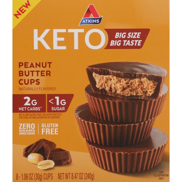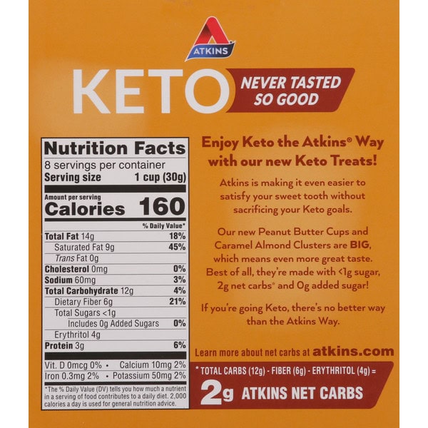 New. Big taste. Never tasted so good. Enjoy Keto the Atkins way with our new Keto Treats! Atkins is making it even easier to satisfy your sweet tooth without sacrificing your Keto goals. Our new Peanut Butter Cups and Caramel Almond Clusters are big, which means even more great taste. Best of all, they’re made with less than 1 g sugar, 2 g net carbs and 0 g added sugar! If you’re going Keto, there’s no better way than the Atkins Way. Atkins Keto Peanut Butter Cups are big. Big peanut butter flavor. Big creamy texture. Big satisfying taste without a ton of added sugars or net carbs. So while you’re enjoying more, you’re thinking less about how to do Keto – the Atkins way. Sustainable Forestry Initiative: Certified sourcing. www.sfiprogram.org.