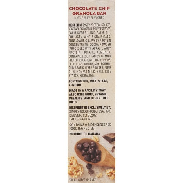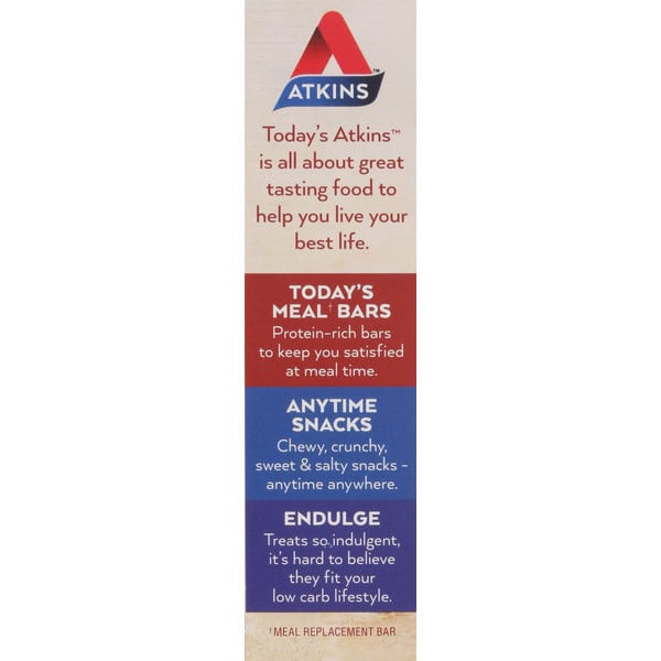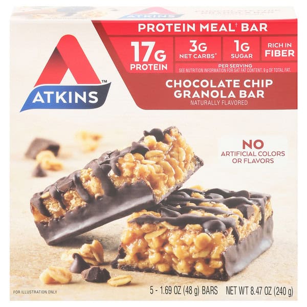 • Chocolate Chip Granola Protein Meal Bar. This is today’s Atkins. This sweet and crispy bar will delight your taste buds. Includes one box of 5 ready-to-eat bars.