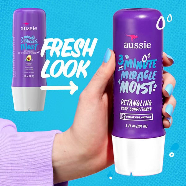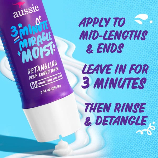 Welcome to hair hydration heaven! Aussie 3 Minute Miracle Moist Detangling Deep Conditioner quenches dry, knotted hair in just 3 minutes-and detangles fast with up to 90% less hair breakage.* This hardworking hydration miracle absorbs quickly and deeply to transform damaged, dry hair into silky, ready-to-style strands. It’s the must-have step in your hair care routine that saves you time and sets you up for the style you want. Plus, it’s certified PETA Cruelty-Free and made without parabens, sulfates, or dyes-even more to feel good about. This rich, creamy formula contains 3x more moisture than an ordinary conditioner and is infused with nourishing avocado oil. It’s great for hair types straight to curly. Just massage into clean, wet hair from mid-length to ends, let it work its magic for 3 minutes and rinse out. You’ll emerge from the shower with hair that feels and smells amazing and is primed for your perfect style. For the ultimate moisture trifecta, use it with Miracle Moist Shampoo and Miracle Moist Conditioner every time you need a boost of hydration and an extra hand with detangling. Finally, you can give your hair all the moisture it deserves and say goodbye to painful detangling and breakage. AUSSome style, here you come! *Vs. non-conditioning.