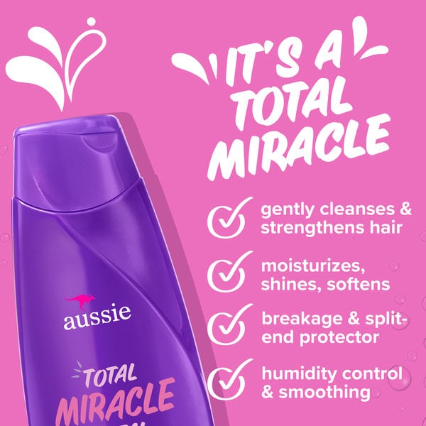 When you look in the mirror, are you staring at dry, damaged, locks that cry out for moisture? If so, then get ready to be wowed by Aussie’s Total Miracle Shampoo as part of your wash day routine. Made for all types of hair, whether it’s straight, wavy, curly, or coily, our Total Miracle Shampoo delivers a gentle cleanse that is absolutely transformational for hair, restoring it to the gorgeous glory it deserves. This paraben-free formula is made with apricot oil and delivers seven AUSSome benefits that are sure to totally rock your hair’s world: strengthening against damage, softness, split-end protection, moisture, humidity control, shine, and smoothing. Plus, it gently cleans each strand leaving you with glamorous locks that are sure to turn heads. Simply apply a generous amount of Aussie Total Miracle Shampoo and work it into your hair with your fingers from root to tip. As Aussie Total Miracle Shampoo works its magic on each individual strand of hair, close your eyes, and take in the luxuriant scents of citrus, florals, and musk that will freshen your hair all day long. Rinse, and enjoy the renewed softness and strength of your rejuvenated hair. AUSSome hair days, here you come! Aussie is a PETA certified cruelty-free brand.