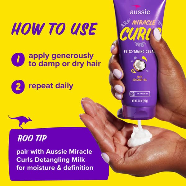 Have your curls and coils begun to look extra frizzy and left you feeling flat lately? Well, it’s time to fight that stubborn frizz with Miracle Curls Frizz-Taming Cream from Aussie! Add shine, reduce frizz, and unlock a smooth, defined look for your gorgeous curls when you apply Miracle Curls Frizz-Taming Cream daily with your regular haircare routine. Simply apply Miracle Curls Frizz-Taming Cream generously to your damp or dry curly locks, using your fingers to work the hair cream from root to tip. As it nourishes your hair with moisture, you’ll bask in the scent of grapefruit, blackberry, and peach wafting from your rejuvenated hair as you style it to your heart’s content. Now, step back and take in the smooth, shiny, glamourous new look of your curly locks. Soft, bouncing and ready to face the day, Miracle Curls Frizz-Taming Cream leaves your hair feeling fresh, you feeling confident, and your look as bold and beautiful as you want to be. Because who runs the world? CURLS! And while Miracle Curls Frizz-Taming Cream may be hard on frizz, it’s not hard on animals. Not only is Aussie a PETA certified cruelty-free brand, but Miracle Curls Frizz Free is free of sulfates too!