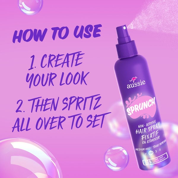 HOW TO SPRUNCH: Hold the bottle 8-10 inches away and spray onto dry, styled hair to finish your style for all day AUSSome hair