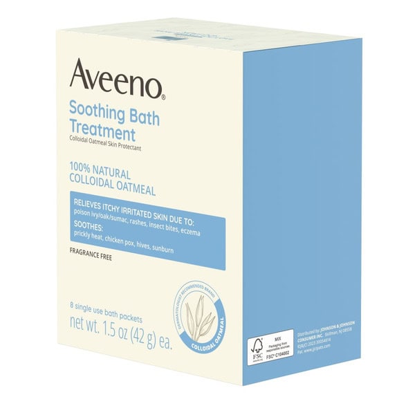 Aveeno Fragrance-Free Soothing Bath Treatment with 100% Natural Colloidal Oatmeal helps relieve itchy, irritated skin due to poison ivy, poison oak, poison sumac, rashes, insect bites & eczema. Recommended by professionals, this soothing bath soak provides relief of itchy, irritated & dry skin while soothing prickly heat (heat rash), chicken pox, hives & sunburn. Formulated with 100% natural colloidal oatmeal, a long recognized ingredient that relieves itching naturally, the soothing bath treatment disperses in bathwater to treat dry, irritated skin while cleansing & moisturizing, for soft, smooth, healthy-looking skin. This soothing bath soak is suitable for eczema and sensitive skin has been allergy tested & is free of fragrance, paraben, dyes & soap. From the dermatologist-recommended brand for over 70 years, use the individually wrapped bath packets along with Aveeno Skin Relief Body Wash & Moisturizing Lotion to soothe your entire body.