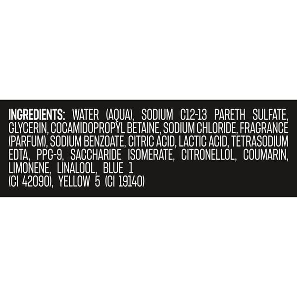 Water, Sodium C12-13 Pareth Sulfate, Glycerin, Cocamidopropyl Betaine, Sodium Chloride, Fragrance, Sodium Benzoate, Citric Acid, Lactic Acid, Tetrasodium Edta, Ppg-9, Saccharide Isomerate, Blue 1 (ci 42090), Yellow 5 (ci 19140)