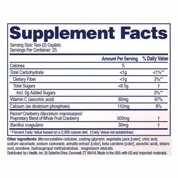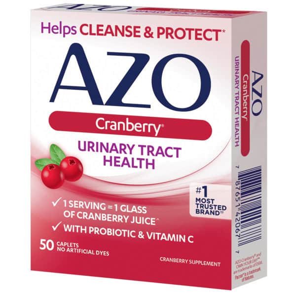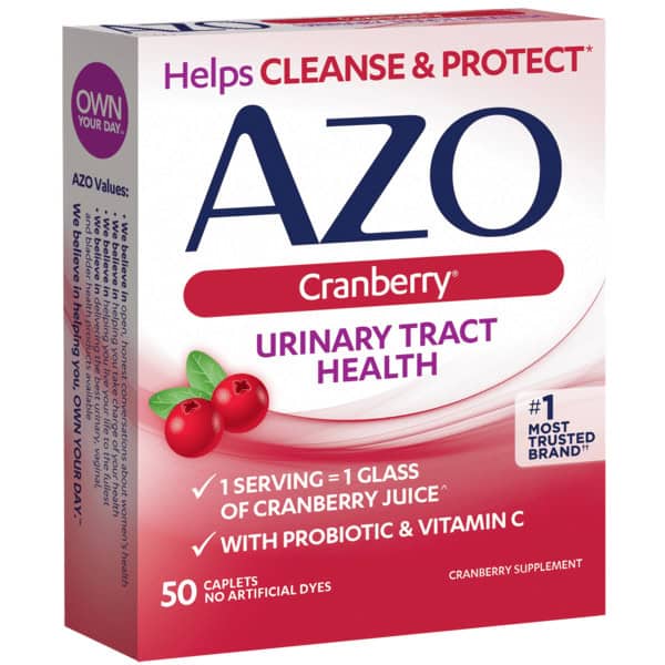 Cranberry Supplement. Azo Cranberry contains no artificial flavors, artificial dyes, yeast, wheat or gluten. Not a low calorie food. Please see the supplement facts panel for further information on sugar and calorie content. Helps cleanse & protect. 1 serving = 1 glass of cranberry juice (Biological activity of 10 oz cranberry juice cocktail). With probiotic & vitamin C. No. 1 most trusted brand (No. 1 most trusted brand based on total Azo brand Nielsen data through 6/8/19 and the 2019 pharmacy times survey (urinary pain relief and cranberry supplement categories)). No artificial dyes. Looking to maintain a healthy urinary tract? Taking cranberry as part of your daily routine can help promote urinary healthy. But not all cranberry is created equal! Azo Cranberry is made with Pacran cranberry powder, shown to help cleanse and protect the urinary tract. Azo Values: We believe in open, honest conversations about women’s health. We believe in helping you take charge of your health. We believe in helping you live your life to the fullest. We believe in delivering in delivering the best urinary, vaginal, and bladder health products available. We believe in helping you, own your day. www.azoproduct.com. For questions, concerns or to report an adverse event, call 800-722-3476. Visit www.azoproducts.com to read customer reviews. (These statements have not been evaluated by the Food and Drug Administration. This product is not intended to diagnose, treat, cure or prevent any disease.) Made in the USA with US and imported materials.
