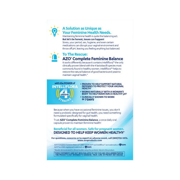• AZO COMPLETE FEMININE BALANCETM TO THE RESCUE! It works differently because it contains INTELLIFLORATM the only clinically proven probiotic blend with the 4 species of beneficial bacteria most commonly found in healthy women