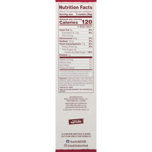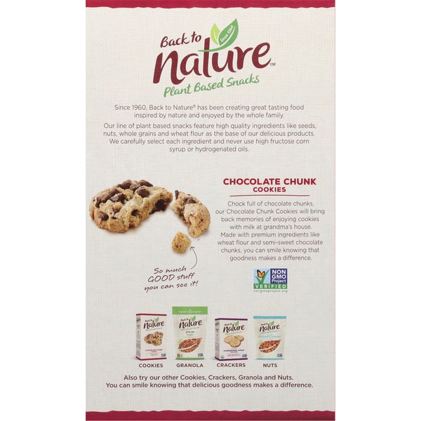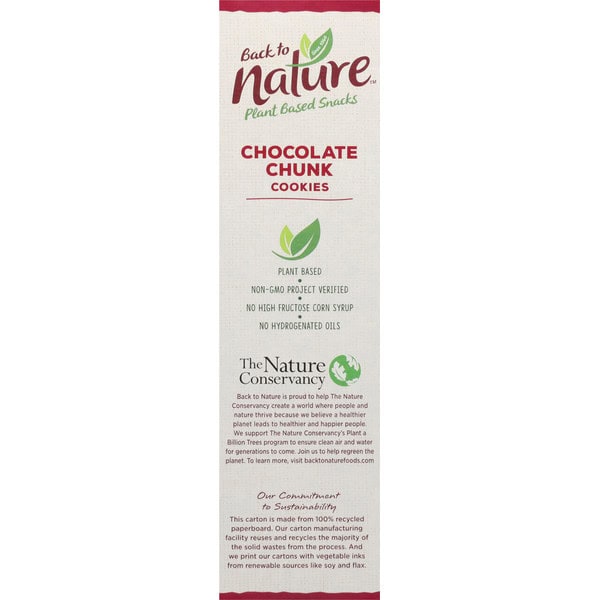 Plant based snacks. Wheat flour & semi-sweet chocolate chunks. Non GMO Project verified. nongmoproject.org. New look same great taste! Since 1960. No hydrogenated oils. No high fructose corn syrup. Simply delicious, simply good. It’s all good in here! Since 1960, Back to Nature has been creating great tasting food inspired by nature and enjoyed by the whole family. Our line of plant based snacks feature high quality ingredients like seeds, nuts, whole grains and wheat flour as the base of our delicious products. We carefully select each ingredients and never use high fructose corn syrup or hydrogenated oils. Other than real honey, in our plant based snacks we avoid any ingredients sourced from animals. Our promise has been and always will be to create foods that are – simply delicious, simply good. Chocolate Chunk Cookies: Chock full of chocolate chunks, our Chocolate Chunk Cookies will bring back memories of enjoying cookies with milk at grandma’s house. Made with premium ingredients like wheat flour and semi-sweet chocolate chunks, you can smile knowing that goodness makes a difference. So much good stuff you can see it! www.backtonaturefoods.com. Question or comments? Call 1-855-346-2225 or visit www.backtonaturefoods.com. Also try our other cookies, crackers, granola and nuts. You can smile knowing that delicious goodness makes a difference. 100% recycled paperboard. The Nature Conservancy: Back to nature is proud to help The Nature Conservancy create a world where people and nature thrive because we believe a healthier planet leads to healthier and happier people. We support The Nature Conservancy’s Plant a Billion Trees program to ensure clean air and water for generations to come. Join us to help regreen the planet. To learn more, visit backtonaturefoods.com. Our Commitment to Sustainability: This carton is made from 100% recycled paperboard. Our carton manufacturing facility reuses and recycles more than 95% of the solid wastes from the process. And we print our cartons with vegetable inks from renewable sources like soy and flax.