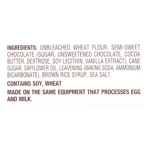 Unbleached Wheat Flour, Semisweet Chocolate (sugar, Unsweetened Chocolate, Cocoa Butter, Dextrose, Soy Lecithin, Vanilla Extract), Cane Sugar, Safflower Oil, Brown Rice Syrup, Baking Soda, Sea Salt.