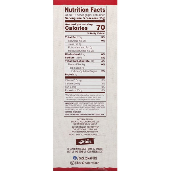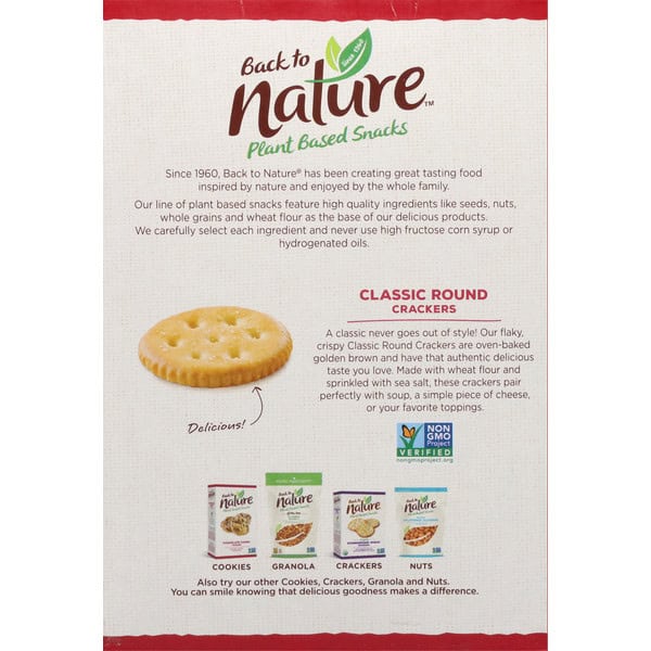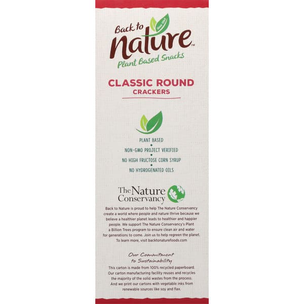 Plant based snacks. No hydrogenated oils. No high fructose corn syrup. Non GMO Project verified. nongmoproject.org. Wheat flour, safflower oil & sea salt. New look same great taste! Since 1960. Simply delicious, simply good. It’s all good in here! Since 1960, Back to Nature has been creating great tasting food inspired by nature and enjoyed by the whole family. Our line of plant based snacks feature high quality ingredients like seeds, nuts, whole grains and wheat flour as the base of our delicious products, We carefully select each ingredient and never use high fructose corn syrup or hydrogenated oils. Other than real honey, in our plant based snacks we avoid any ingredients sourced from animals. Our promise has been and always will be to create foods that are – Simply Delicious, Simply Good. Classic Round Crackers: A classic never goes out of style! Our flaky, crispy Classic Round Crackers are oven-baked golden brown and have that authentic delicious taste you love. Made with wheat flour and lightly sprinkled with sea salt, these crackers pair perfectly with soup, a simple piece of cheese, or your favorite toppings. So much good stuff you can see it! This package is sold by weight, not by volume. Some settling of contents may have occurred during shipping and handling. nongmoproject.org. www.backtonaturefoods.com. To learn more about Back to Nature: Visit us and send us your feedback at Facebook/backtoNATURE. Twitter (at)Back2NatureFood. Questions or comments? Call 1-855-346-2225 or visit www.backtonaturefoods.com. The Nature Conservancy: Back to Nature is proud to help The Nature Conservancy create a world where people and nature thrive because we believe a healthier planet leads to healthier and happier people. We support The Nature Conservancy’s Plant a Billion Trees program to ensure clean air and water for generations to come. Join us to help regreen the planet. To learn more, visit backtonaturefoods.com. Also try our other Cookies, Crackers, Granola and Nuts. You can smile knowing that delicious goodness makes a difference. Our commitment to Sustainability This carton is made from 100% recycled paperboard. Our carton manufacturing facility reuses and recycles more than 95% of the solid wastes from the process. And we print our cartons with vegetable inks from renewable sources like soy and flax. 100% recycled paperboard.