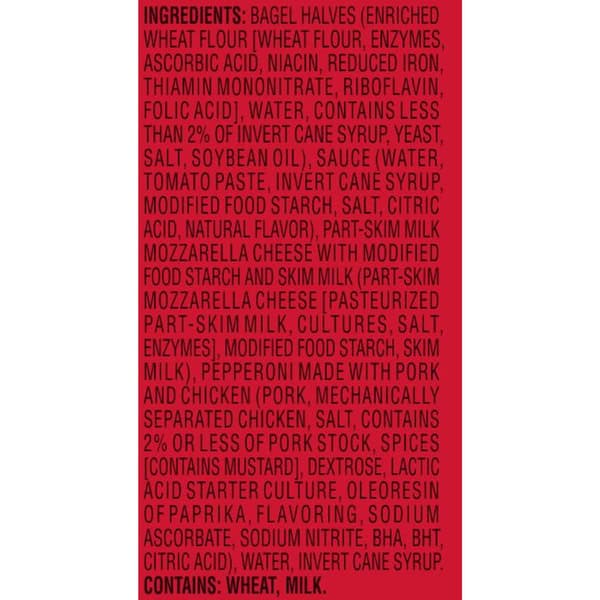 Bagel Halves (enriched Wheat Flour |wheat Flour, Enzymes Ascorbic Acid, Niacin, Reduced Iron, Thiamin Mononitrate, Riboflavin, Folic Acid], Water, Contains Less Than 2% Of Invert Cane Syrup, Yeast, Salt, Soybean Oil), Sauce (water, Tomato Paste, Invert Cane Syrup, Modified Food Starch, Salt, Citric Acid, Natural Flavor), Part-skim Milk Mozzarella Cheese With Modified Food Starch And Skim Milk (part-skim Mozzarella Cheese |pasteurized Part-skim Milk, Cultures, Salt, Enzymes], Modified Food Starch, Skim Milk), Pepperoni Made With Pork And Chicken (pork, Mechanically Separated Chicken, Salt, Contains 2% Or Less Of Pork Stock, Spices [contains Mustard], Dextrose, Lactic Acid Starter Culture, Oleoresin Of Paprika, Flavoring, Sodium Ascorbate Sodium Nitrite, Bha, Bht, Citric Acid), Water, Invert Cane Syrup