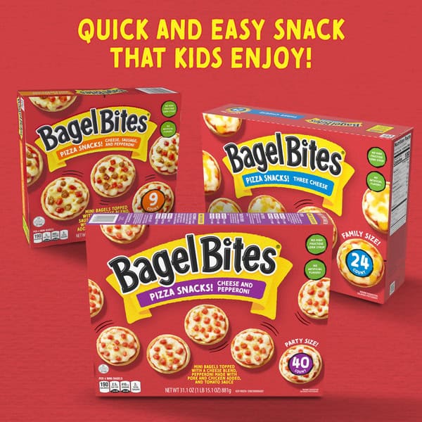 • Bagel Bites Cheese & Pepperoni Mini Bagels are an easy and fun frozen pizza snack
