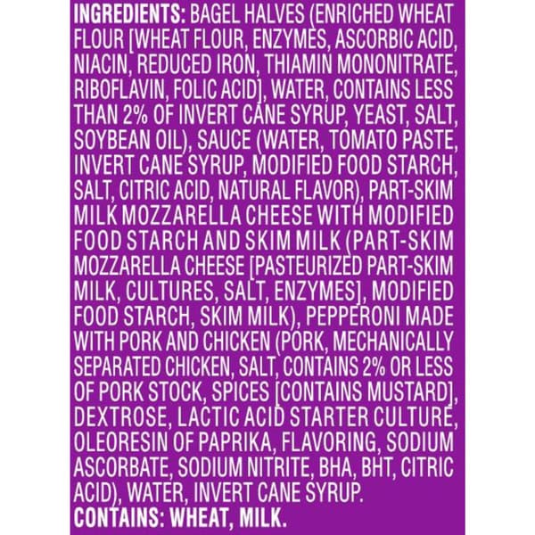Bagel Halves (enriched Flour [wheat Flour, Enzyme, Ascorbic Acid, Niacin, Reduced Iron, Thiamine Mononitrate, Riboflavin, Folic Acid], Water, Salt, Invert Cane Syrup, Yeast, Soybean Oil), Topping (cheese Blend [part-skim Mozzarella Cheese (part-skim Milk, Cheese Cultures, Salt, Enzymes), Modified Food Starch, Skim Milk], Diced Pepperoni Made With Pork, Chicken And Smoke Flavor Added [pork, Mechanically Separated Chicken, Salt, Spices, Water, Dextrose, Seasonings (natural Spice Extractives, Extractives Of Paprika, Natural Smoke Flavor, Bha, Bht And Citric Acid), Lactic Acid Starter Culture, Sodium Nitrite]), Sauce (water, Tomato Paste, Invert Cane Syrup, Modified Food Starch, Salt, Methyl Cellulose, Citric Acid, Potassium Chloride, Ammonium Chloride, Spice, Yeast Extract, Natural Flavor, Calcium Lactate), Water, Invert Cane Syrup.