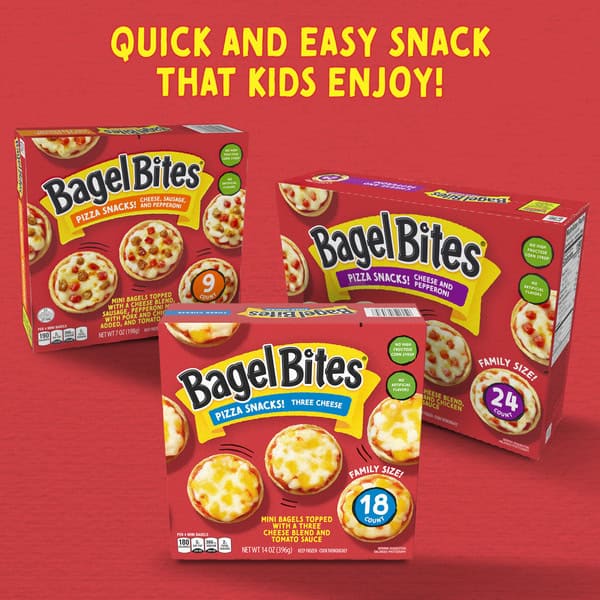 • Bagel Bites Three Cheese Mini Bagels are an easy and fun frozen pizza snack
