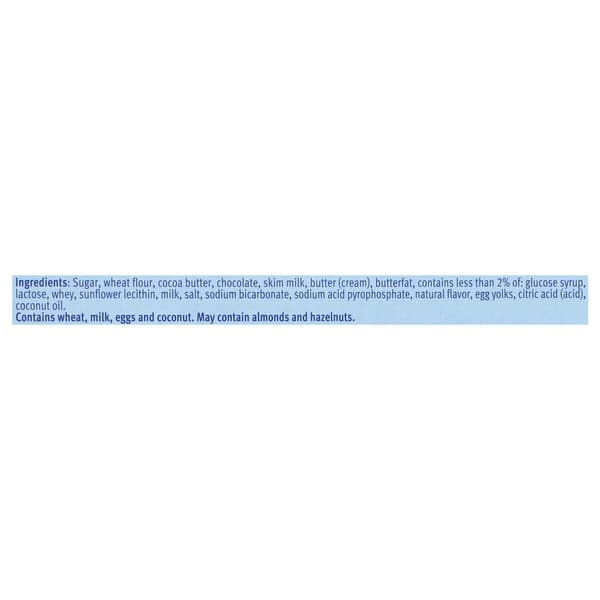 Sugar, Wheat Flour, Cocoa Butter, Chocolate, Skim Milk, Butter (cream), Butterfat, Contains Less Than 2% Of: Glucose Syrup, Lactose, Whey, Sunflower Lecithin, Milk, Salt, Sodium Bicarbonate, Sodium Acid Pyrophosphate, Natural Flavor, Egg Yolks, Citric Acid (acid), Coconut Oil