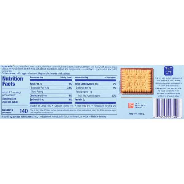 Bahlsen by design. We take out signature biscuits and carefully settle each one into smooth chocolate, creating the perfect edges for nibbling. The Tet sign shows Heiroglyphs of a rising sun and snake. Hermann Bahlsen discovered it in Egypt. The thought is everlasting. that was his goal. To build something that endures. Four generations later, it is till our goal. A classic, framed. The Bahlsen Family. . A proud German Family business. Since 1889. Without addition of colorings and preservatives. With love, dedication and wheat flour from trusted farmers.