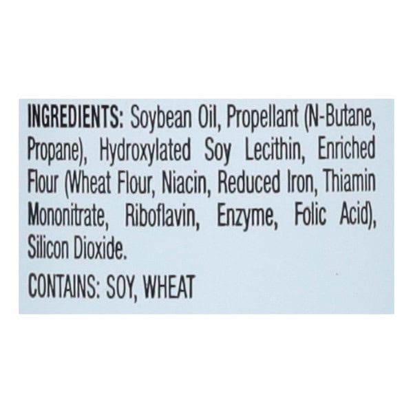 Soybean Oil*, Propellant Isobutane, Propane), Hydroxylated Soy Lecithin, Soy Lecithin, Enriched Wheat Flour (niacin, Iron, Thiamine Mononitrate, Riboflavin, Folic Acid), Silicon Dioxide, Tbhq (to Ensure Freshness).