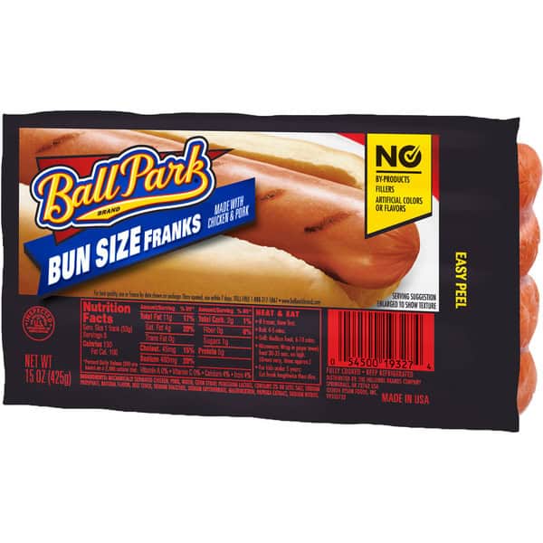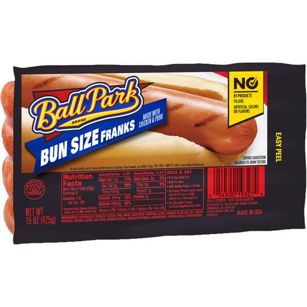 Ball Park Hot Dogs are as much a summer American tradition as a trip to the ballpark or fireworks on the 4th of July, so you can enjoy the flavor of summer whenever the mood strikes. Our tender and juicy hot dogs plump when you cook ‘em, and are a staple at everything from backyard BBQs to a game-day tailgate to a quick weeknight dinner. Sky’s the limit for toppings. A chili dog a sprinkling of cheddar cheese and onions? Sure! Wrapped in bacon? Love the gourmet twist! You can even create a hot dog buffet, where everyone will find a combination to love. Whether you’re enjoying a classic hot-off-the-grill dog or loading one up Chicago style, Ball Park’s premium hot dogs will always take you back to that authentic taste of summer., One 8 count package of Ball Park Bun Length Frank Hot Dogs, Made with Chicken & Pork, No Fillers or By-Products, No artificial colors or flavors, Perfect for grill outs and barbeques