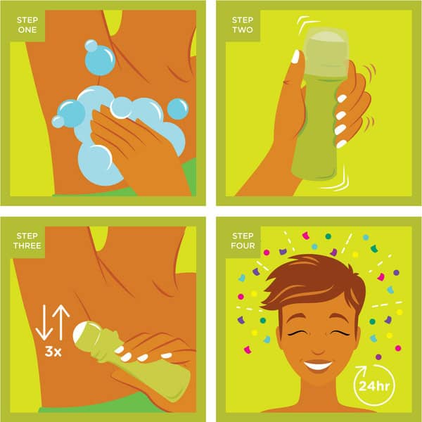 Shake well and apply 3-4 strokes over the entire underarm area. Allow to dry before getting dressed.
