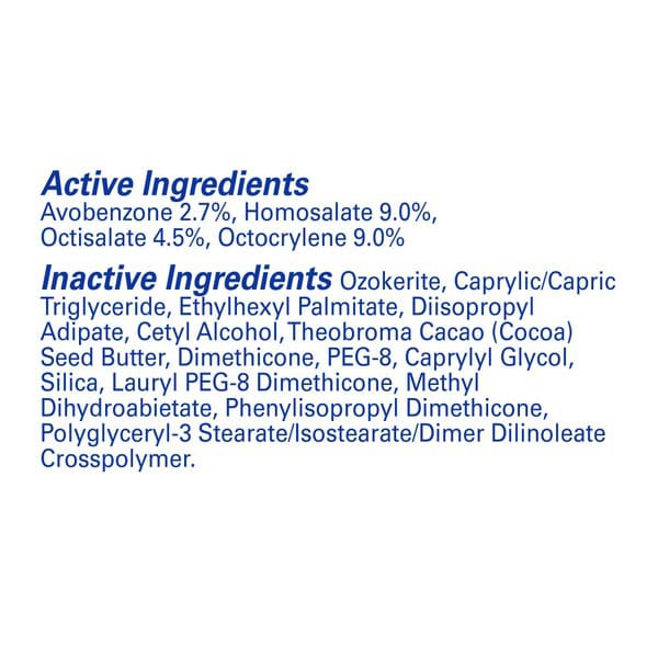 Inactive Ingredients: Ozokerite, Caprylic/capric Triglyceride, Ethylhexyl Palmitate, Diisopropyl Adipate, Cetyl Alcohol, Theobroma Cacao (cocoa) Seed Butter, Dimethicone, Peg-8, Caprylyl Glycol, Silica, Dimethicone, Polyglyceryl-3 Stearate/isostearate/dimer Dilinoleate Crosspolymer