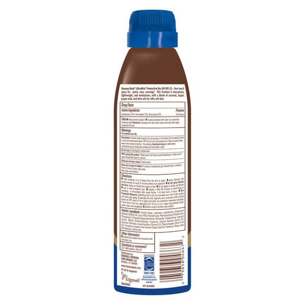 Enjoy a sun-kissed glow with Banana Boat Protective Dry Oil Clear Spray Sunscreen with SPF 25. This lightweight, non-greasy dry oil tanning spray formula is made with natural argan oil and will leave your skin feeling silky-smooth. Banana Boat tanning oil with SPF is water-resistant for up to 80 minutes and features a cap-free twist ‘n lock design and UltraMist technology for quick and easy coverage.