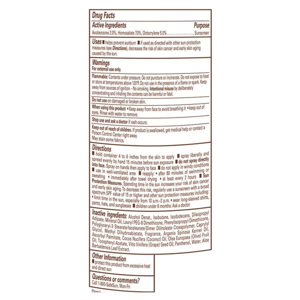 Hold container 4 to 6 inches from the skin to apply. Spray liberally and spread evenly by hand 15 minutes before sun exposure. Do not spray directly into face. Spray on hands then apply to face. Do not apply in windy conditions. Use in well-ventilated area. Reapply: after 80 minutes of swimming or sweating; immediately after towel drying; at least every 2 hours. Sun Protection Measures. Spending time in the sun increases your risk of skin cancer and early skin aging. To decrease this risk, regularly use a sunscreen with a broad spectrum SPF of 15 or higher and other sun protection measures including: limit time in the sun, especially from 10 a.m.-2 p.m.; wear long-sleeved shirts, pants, hats, and sunglasses. Children under 6 months: Ask a doctor. Protect this product from excessive heat and direct sun.