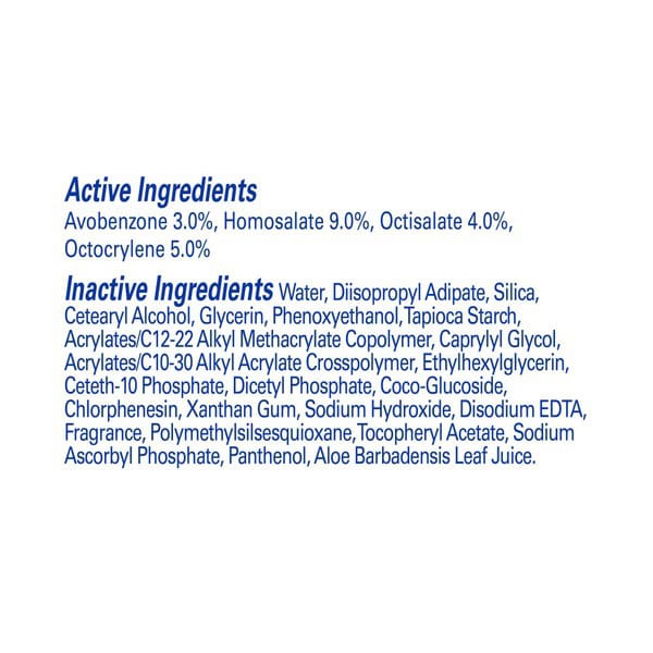 Inactive Ingredients: Water, Diisopropyl Adipate, Silica, Cetearyl Alcohol, Glycerin, Phenoxyethanol, Tapioca Starch, Acrylates/c12-22 Alkyl Methacrylate Copolymer, Caprylyl Glycol, Acrylates/c10-30 Alkyl Acrylate Crosspolymer, Ethylhexylglycerin, Ceteth-10 Phosphate, Dicetyl Phosphate, Coco-glucoside, Chlorphenesin, Xanthan Gum, Sodium Hydroxide, Disodium Edta, Fragrance, Polymethylsilsesquioxane, Tocopheryl Acetate, Sodium Ascorbyl Phosphate, Panthenol, Aloe Barbadensis Leaf Juice
