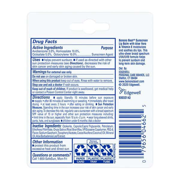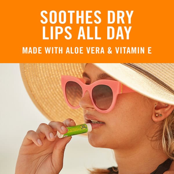 Pucker up to soft and protected lips. Banana Boat Sunscreen Lip Balm SPF 45 with Aloe Vera & Vitamin E moisturizes, conditions, and protects sensitive lips with broad-spectrum UVA/UVB protection that lasts as long as the fun does*. Made with aloe vera & vitamin E, this lip balm with sunscreen is great for everyday use and is water resistant for up to 80 minutes.