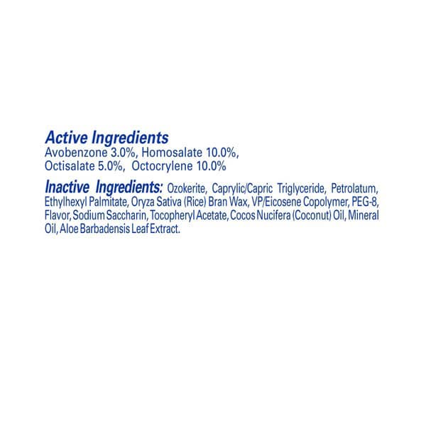 Ozokerite, Caprylic/capric Triglyceride, Petrolatum, Ethylhexyl Palmitate, Oryza Sativa (rice) Bran Wax, Vp/eicosene Copolymer, Peg-8, Flavor, Sodium Saccharin, Tocopheryl Acetate, Cocos Nucifera (coconut) Oil, Mineral Oil, Aloe Barbadensis Leaf Extract.