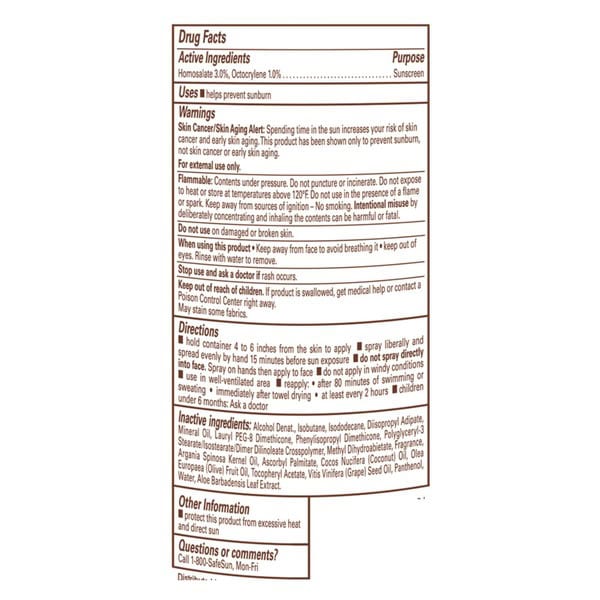 Hold container 4 to 6 inches from the skin to apply. Spray liberally and spread evenly by hand 15 minutes before sun exposure. Do not spray directly into face. Spray on hands then apply to face. Do not apply in windy conditions. Use in well-ventilated area. Reapply: after 80 minutes of swimming or sweating; immediately after towel drying; at least every 2 hours. Children under 6 months: Ask a doctor. Protect this product from excessive heat and direct sun.