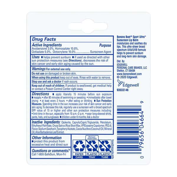 Pucker up to soft and protected lips. Banana Boat Sport Ultra Sunscreen Lip Balm SPF 50 with Aloe Vera & Vitamin E moisturizes, conditions, and protects sensitive lips with broad-spectrum UVA/UVB protection that lasts as long as the fun does*. Made with aloe vera & vitamin E, this lip balm with sunscreen is great for everyday use and is water resistant for up to 80 minutes.