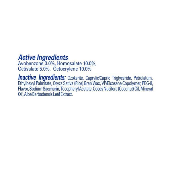 Petrolatum, Polyethylene, Ethylhexyl Palmitate, Trimethylsiloxyphenyl Dimethicone, Microcrystalline Wax, Isopropyl Myristate, Theobroma Cacao (cocoa) Seed Butter, Peg-8, Caprylyl Glycol, Sodium Saccharin, Cocoa Nucifera (coconut) Oil, Mineral Oil, Aloe Barbadensis Leaf Extract, Peg-8 Dimethicone, Octyldodecanol, Retinyl Palmitate, Silica, Tocopheryl Acetate, Ascorbic Acid, Sodium Propxyhydroxypropyl Thiosulfate Silica, Propylparaben, Butylparaben.