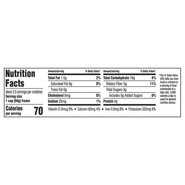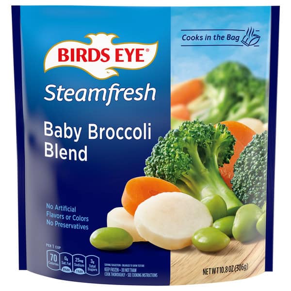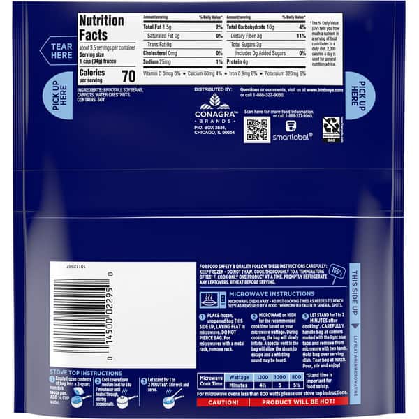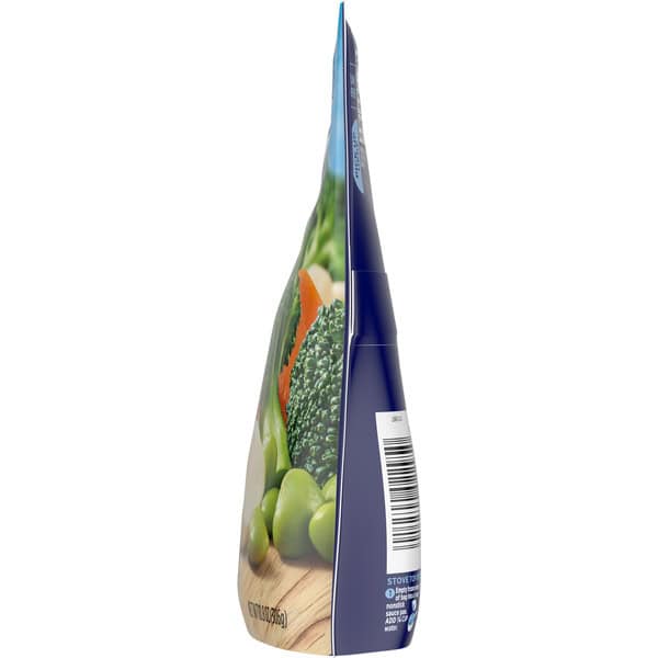 Microwave Instructions: Microwave ovens vary – adjust cooking times as needed to reach 165 degrees F as measured by a food thermometer taken in several spots. 1. Place frozen, unopened bag this side up, laying flat in microwave. Do not pierce bag. For microwaves with a metal rack, remove rack. 2. Microwave on high fro the recommended cook time based on your microwave wattage. During cooking, the bag will slowly inflate. A special vent in the bag will allow the steam to escape and a whistling sound may be heard. 3. Let stand for 1 to 2 minutes after cooking (Stand time is important for food safety). Carefully handle bag at corners marked with the light blue tabs and remove from microwave with two hands. Hold bag over serving dish. Tear bag at notch. Pour, stir and enjoy! Microwave Cook Time: 1200 Wattage; 4-1/2 Minutes. 1000 Wattage; 5 Minutes. 800 Wattage; 5-1/2 Minutes. For microwave ovens less than 800 watts please use stove top instructions. Caution! Product will be hot! Stove Top Instructions: 1. Empty frozen contents of bag into a 2-quart nonstick sauce pan. Add 1/4 cup water. 2. Cook covered over medium heat for 6 to 7 minutes or until heated through, stirring occasionally. 3. Let stand for 1 to 2 minutes (Stand time is important for food safety). Stir well and serve. For Food Safety & Quality Follow these Instructions Carefully: Keep frozen – do not thaw. Cook thoroughly to a temperature of 165 degrees F. Cook only one product at a time. Promptly refrigerate any leftovers. Reheat before serving.