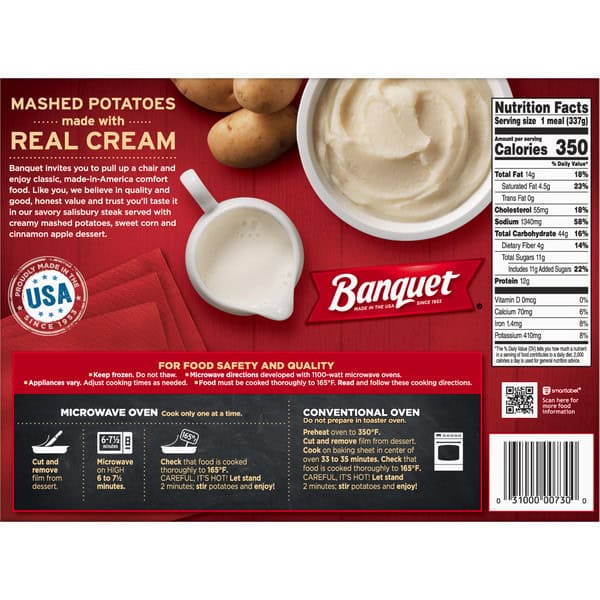 With quality, mouthwatering ingredients, a great meal is minutes away with Banquet Classic Salisbury Steak. Enjoy this savory Salisbury steak, smothered in gravy and served up with hearty sides of creamy mashed potatoes and sweet corn, as well as a cinnamon apple dessert. Made with wholesome ingredients, Banquet’s wide selection of homestyle meals will please everyone in your family. Sit down to a tasty meal tonight, with 350 calories, 12g protein, and 0g trans fat; contains milk, soy, and wheat. Banquet serves up honest, wholesome microwave meals, bringing more value to your table with large portions and quality ingredients. This pack contains 11.88 Ounces of Banquet Classic Salisbury Steak.