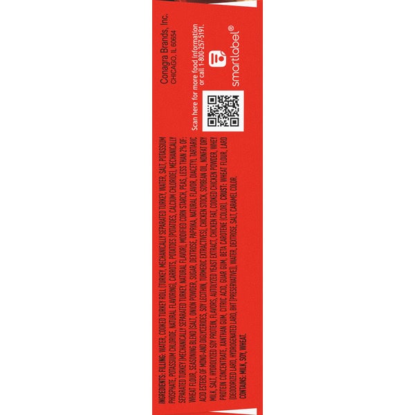 Filling: Water, Cooked Turkey Roll (turkey, Mechanically Separated Turkey, Water, Salt, Potassium Phosphate, Potassium Chloride, Natural Flavoring), Carrots, Potatoes (potatoes, Calcium Chloride), Mechanically Separated Turkey (mechanically Separated Turkey, Natural Flavor), Modified Corn Starch, Peas, Less Than 2% Of: Wheat Flour, Seasoning Blend (salt, Onion Powder, Sugar, Dextrose, Paprika, Natural Flavor, Diacetyl Tartaric Acid Esters Of Mono-and Diglycerides, Soy Lecithin, Turmeric Extractives), Chicken Stock, Soybean Oil, Nonfat Dry Milk, Salt, Hydrolyzed Soy Protein, Flavors, Autolyzed Yeast Extract, Chicken Fat, Cooked Chicken Powder, Whey Protein Concentrate, Xanthan Gum, Citric Acid, Guar Gum, Beta Carotene (color), Crust: Wheat Flour, Lard (deodorized Lard, Hydrogenated Lard, Bht [preservative]), Water, Dextrose, Salt, Caramel Color