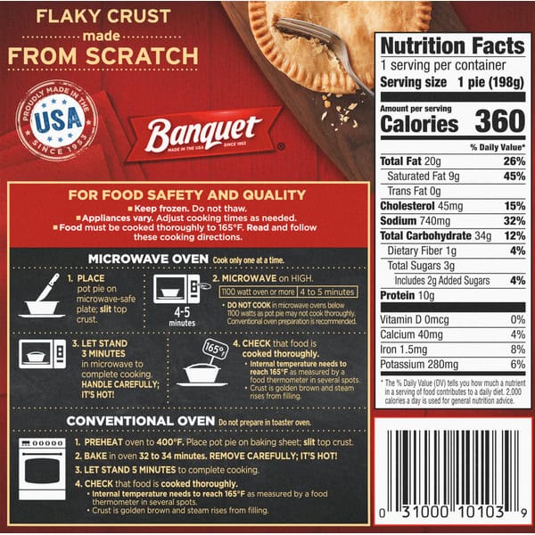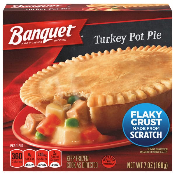 A quality quick meal is minutes away with Banquet Pot Pies. Delight in a hot, quick, and easy comfort meal anytime with this savory Turkey Pot Pie. Serve up a piping hot delight filled with tender chunks of turkey and vegetables simmered in a creamy gravy. Savor the flaky, made-from-scratch crust filled with your favorite comfort food flavor. Enjoy homemade flavor from the microwave or oven on a lunch break or for a quick dinner with this traditional-style entree. This box contains one 7-ounce (198g) serving, with 320 calories and 0g trans fat; contains milk, soy, and wheat. Banquet serves up honest, wholesome microwave meals, bringing more value to your table with large portions and quality ingredients.