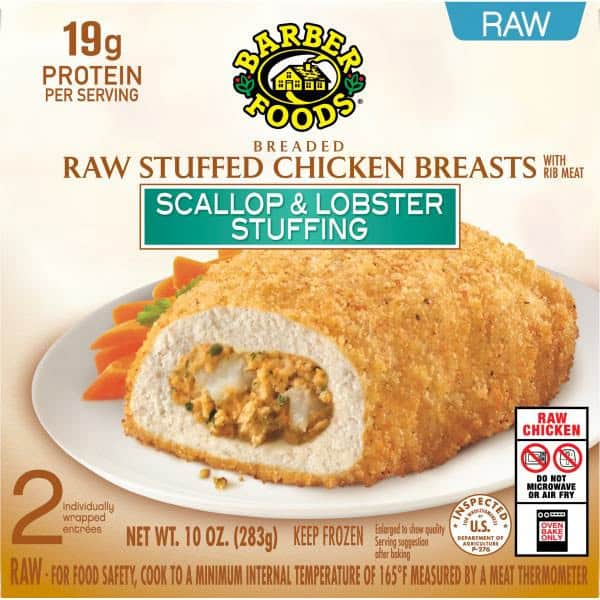For a delicious entree that is easy to prepare, Barber Foods Breaded Raw Stuffed Chicken Breasts Scallop and Lobster are perfect for any night of the week. We start with a combination of scallops and lobster meat, wrap it all in savory, boneless chicken and add crispy golden brown breading. With 19 grams of protein per serving, these frozen stuffed chicken breasts with rib meat are easy to prepare in the oven. For a tasty meal the whole family will enjoy, prepare and serve with a side of roasted vegetables. Includes one 10 oz package of 2 individually wrapped breaded raw stuffed chicken breasts scallop and lobster. With unmatched flavor and quality, Barber Foods provides the best of everything, and that’s been our pledge since we started our business in 1955. Bring Barber Foods stuffed chicken to the table tonight and you’ll find it’s an instant family favorite that’s perfect for every night of the week.
