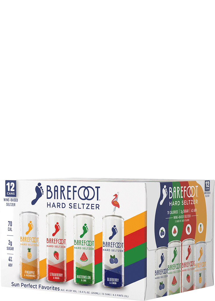 California – Hard Seltzer – 4.0% ABV. Barefoot Hard Seltzer is a great tasting Hard Seltzer made with sparkling water, real wine & natural flavors. Barefoot Hard Seltzers are made with award-winning Barefoot wine.
