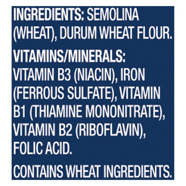 Semolina (wheat), Durum Wheat Flour, Vitamins/minerals: Vitamin B3 (niacin), Iron (ferrous Sulfate), Vitamin B1 (thiamine Mononitrate), Vitamin B2 (riboflavin), Folic Acid