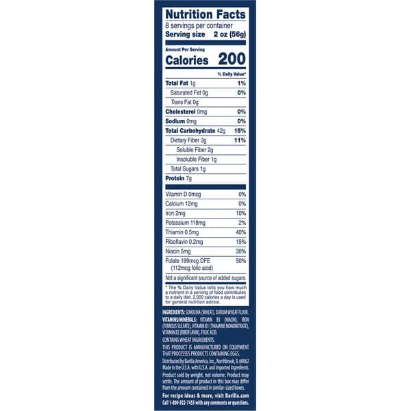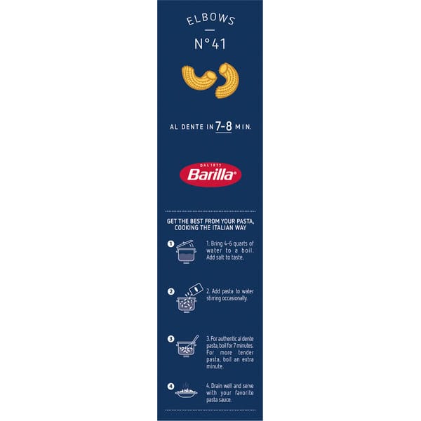Barilla is a family-owned Italian company making pasta since 1877. Barilla brings you the best pasta made with care and the highest quality ingredients; Barilla works to bring you the best pasta that cooks perfectly al dente every time. Our elbows pasta is made from the finest durum wheat and is non-GMO project verified and Kosher Certified. Perfect for pairing with your favorite pasta sauce.