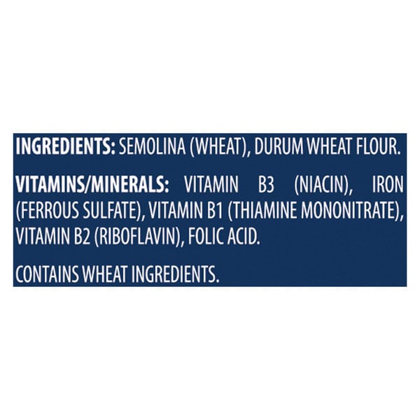 Semolina (wheat), Durum Wheat Flour, Vitamins/minerals: Vitamin B3 (niacin), Iron (ferrous Sulfate), Vitamin B1 (thiamine Mononitrate), Vitamin B2 (riboflavin), Folic Acid