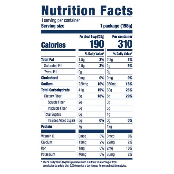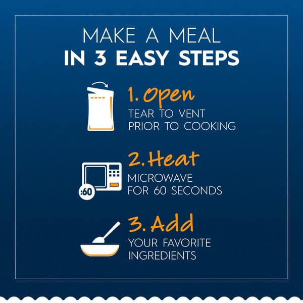 1. Open: Gently knead pouch to separate pasta. Tear to vent prior to cooking. 2. Heat: Microwave for 60 seconds. Or on Stove: Pour pasta and tsp. oil in skillet. Stir 2-4 minutes until heated. 3. Add: Your favorite ingredients and enjoy!