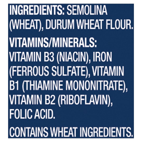 Semolina (wheat), Durum Wheat Flour, Vitamins/minerals: Vitamin B3 (niacin), Iron (ferrous Sulfate), Vitamin B1 (thiamine Mononitrate), Vitamin B2 (riboflavin), Folic Acid