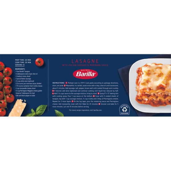 Barilla is a family-owned Italian company making pasta since 1877. Barilla brings you the best pasta made with care and the highest quality ingredients; Barilla works to bring you the best pasta that cooks perfectly al dente every time. Our wavy lasagne is made from the finest durum wheat and is non-GMO project verified and Kosher Certified. Perfect for pairing with your favorite pasta sauce.